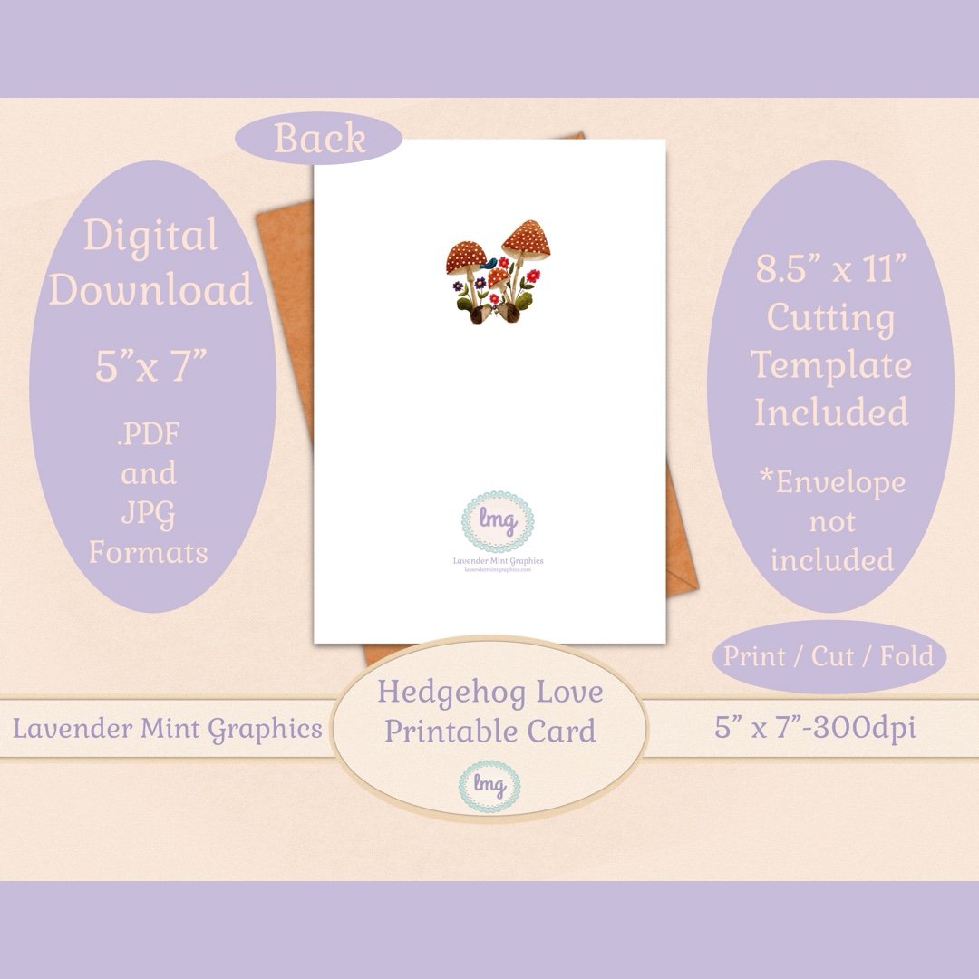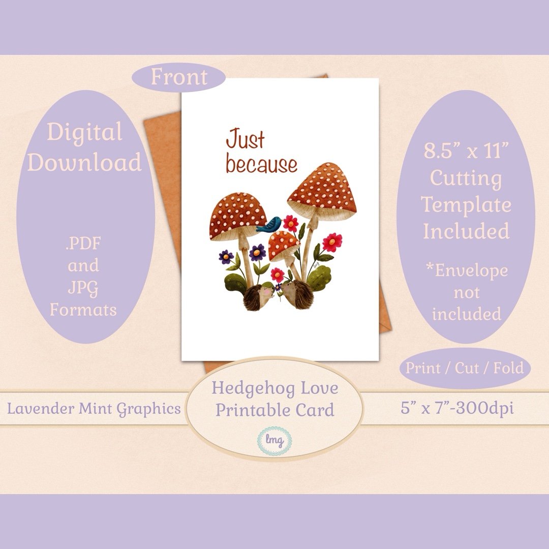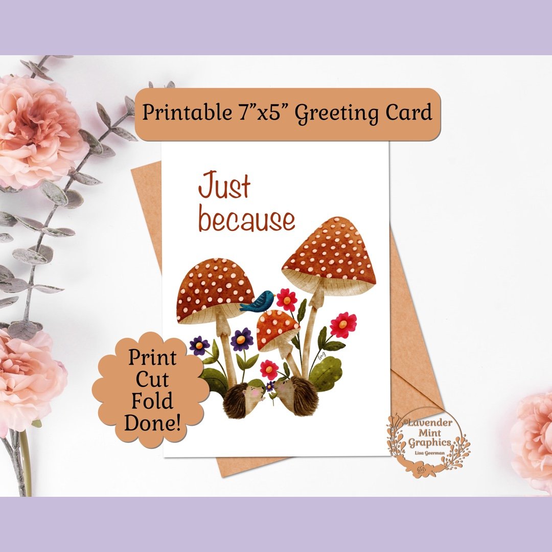 This downloadable, printable "Just Because" card showcases a delightful hedgehog couple nestled in a whimsical mushroom forest, surrounded by vibrant flowers. With a warm and cheerful design, the card features the phrase "Just Because" making it a perfect surprise for sharing love and appreciation any time of the year. The inside is blank so that you can add your own message.