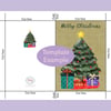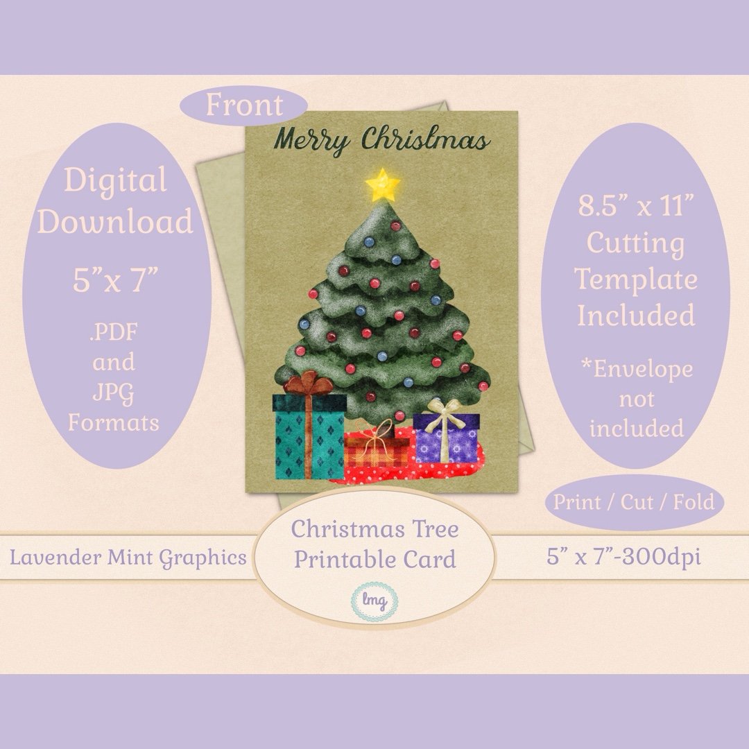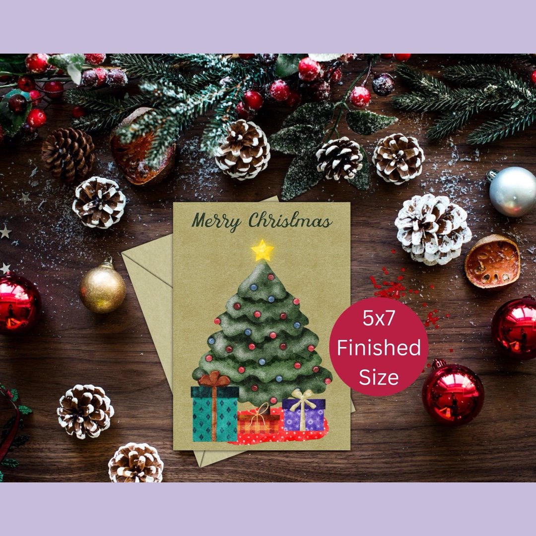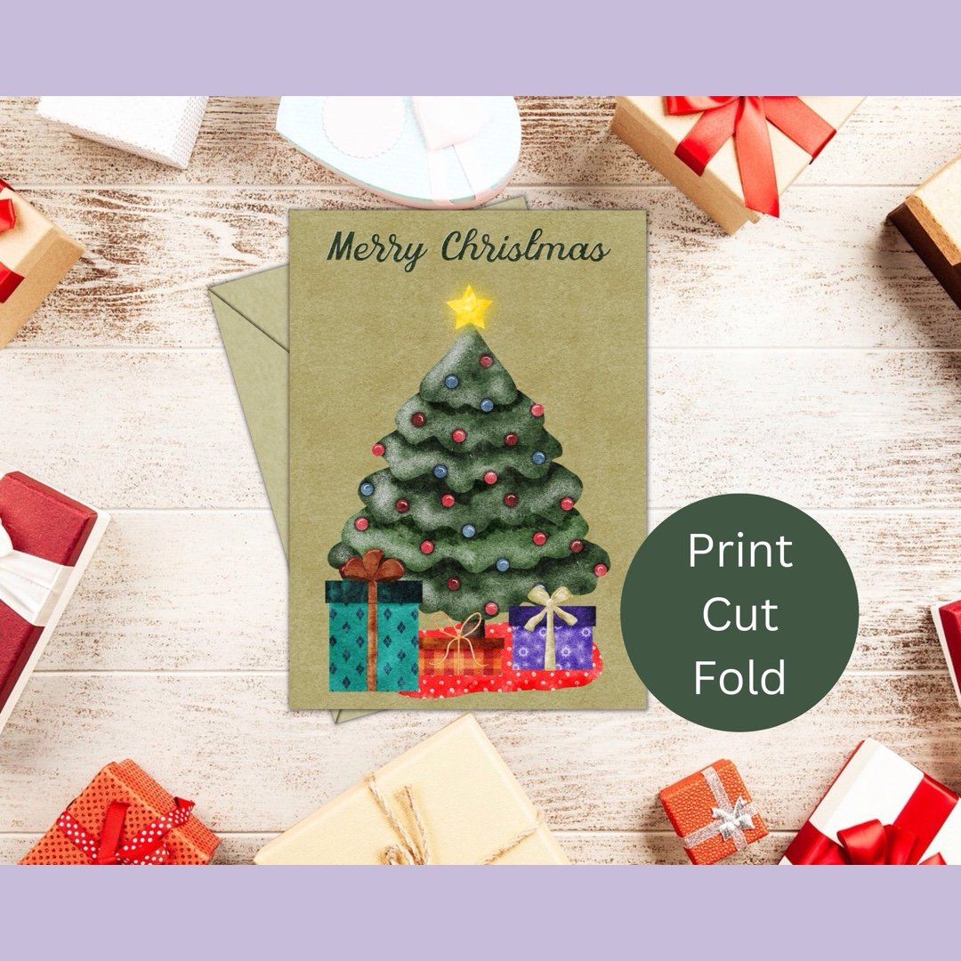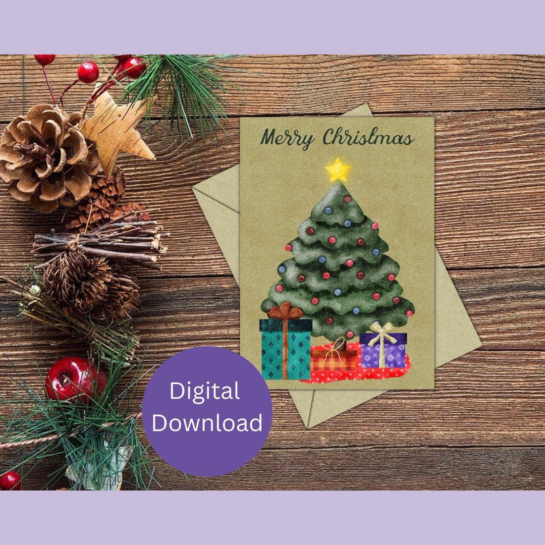 This delightful downloadable and printable Christmas greeting card features a beautifully decorated Christmas tree adorned with twinkling lights. Underneath the tree, colorful gifts wrapped in festive paper await eager hands. The warm, cheerful design captures the magic of the holiday season, making it perfect for sharing joy with loved ones.